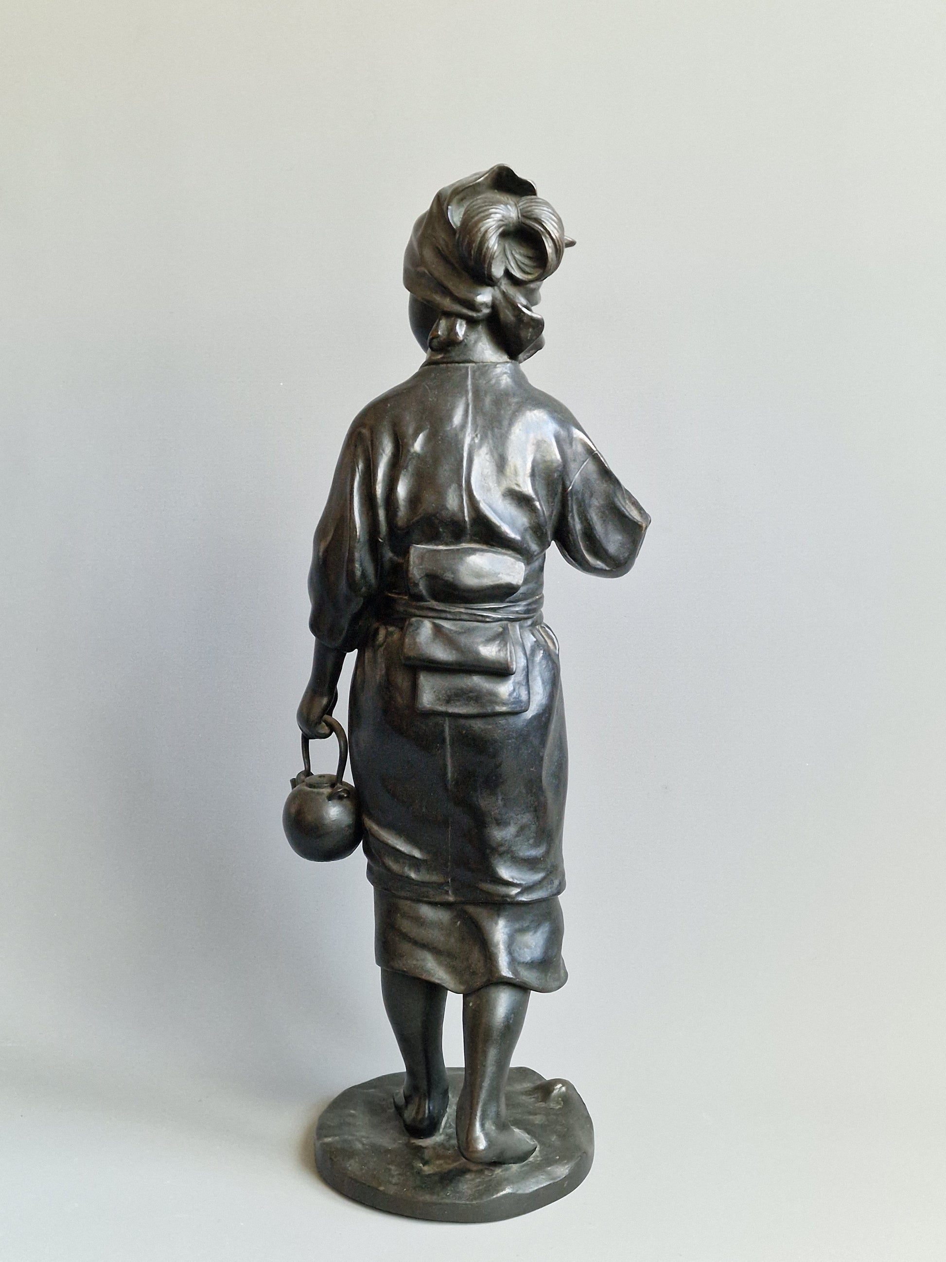 This finely cast bronze okimono depicts a Japanese peasant girl, captured in a moment of quiet movement as she carries a small metal teapot. The figure is modelled with naturalistic detail — from the wrapped headscarf and layered kimono to the bare feet and gentle shift of weight — characteristic of high-quality Meiji-period craftsmanship.