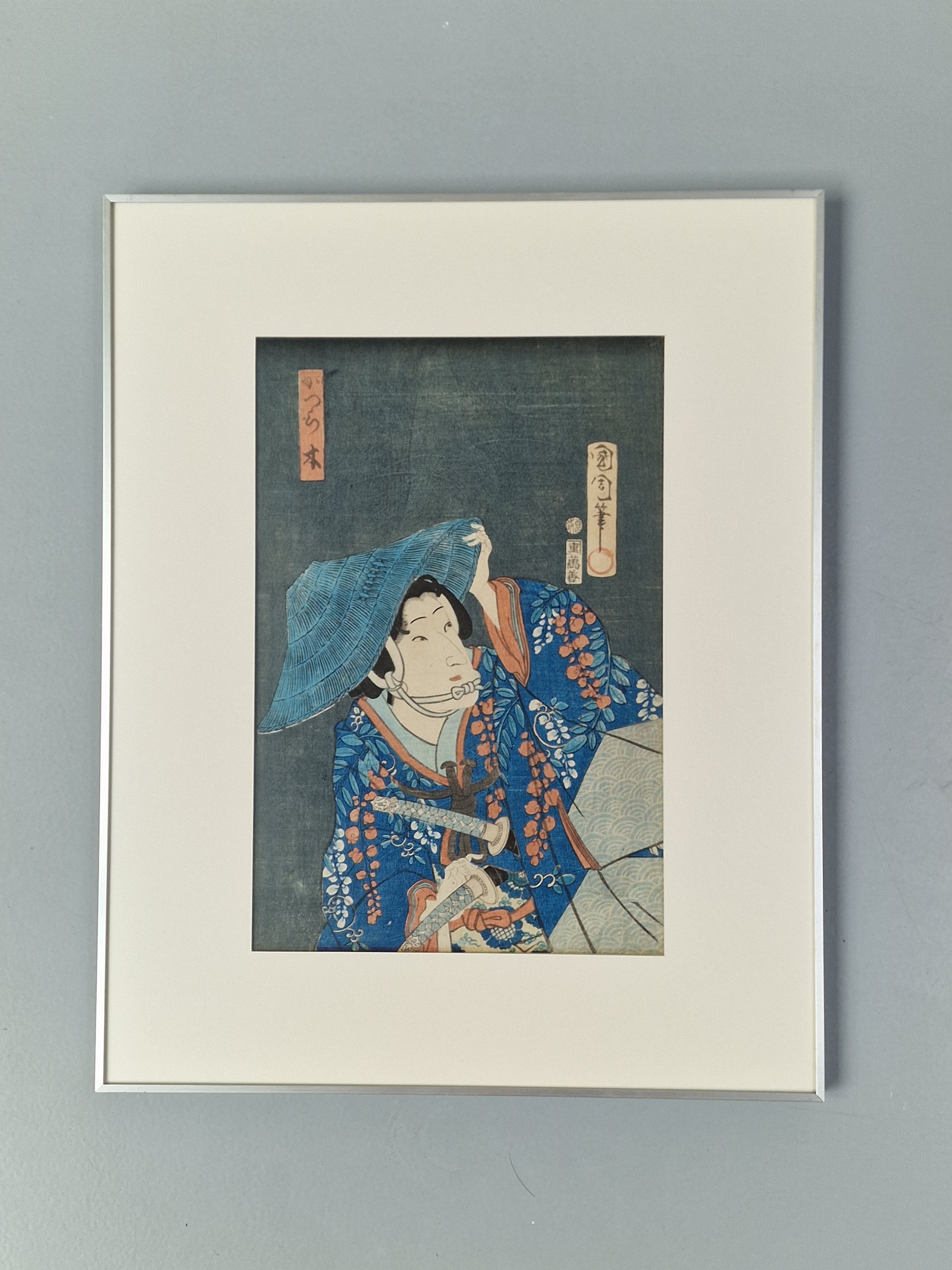 This finely preserved Japanese woodblock print by Toyohara Kunichika (1835–1900) depicts a kabuki actor in a striking blue robe decorated with floral motifs, holding his sword beneath a woven hat. Kunichika, one of the last great masters of ukiyo-e, was celebrated for his expressive portraits of kabuki performers and vivid use of color during the Meiji period (1868–1912).