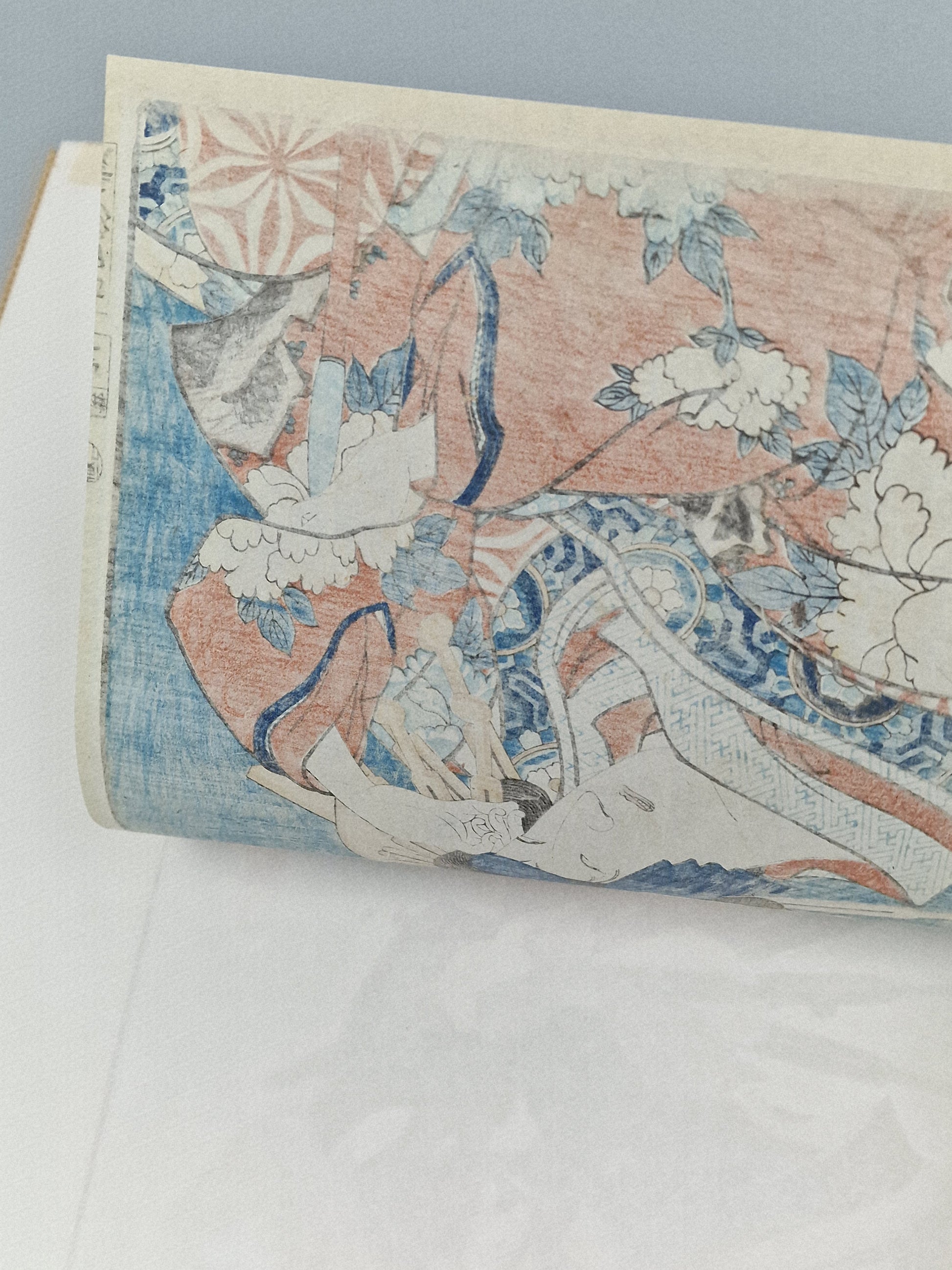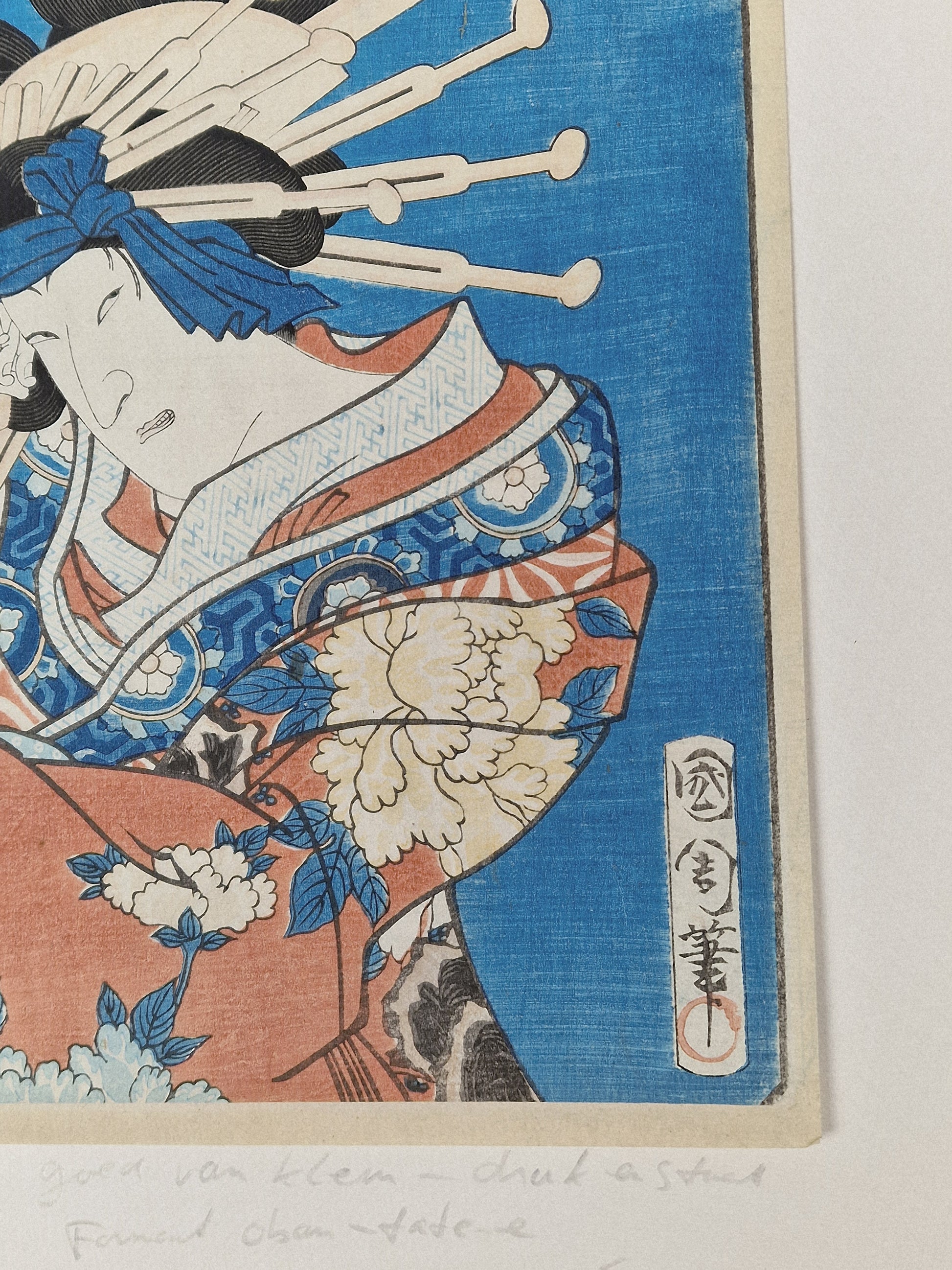 Kunichika, a leading disciple of Utagawa Kunisada, was celebrated for his portraits of actors and beauties that captured both the vibrancy of the ukiyo-e tradition and the emerging modern sensibility of Meiji Japan. This print exemplifies his mastery of color, pattern, and psychological nuance, revealing both the allure and dignity of Japan’s courtesan culture.