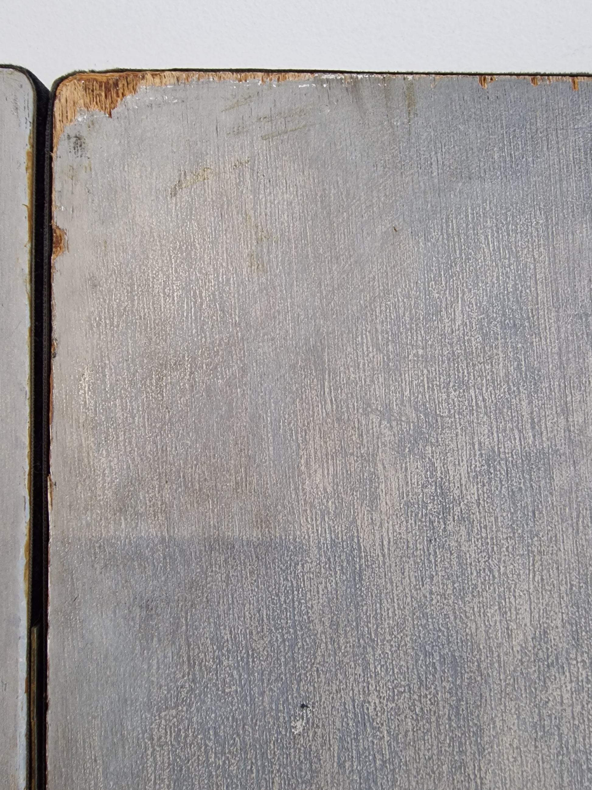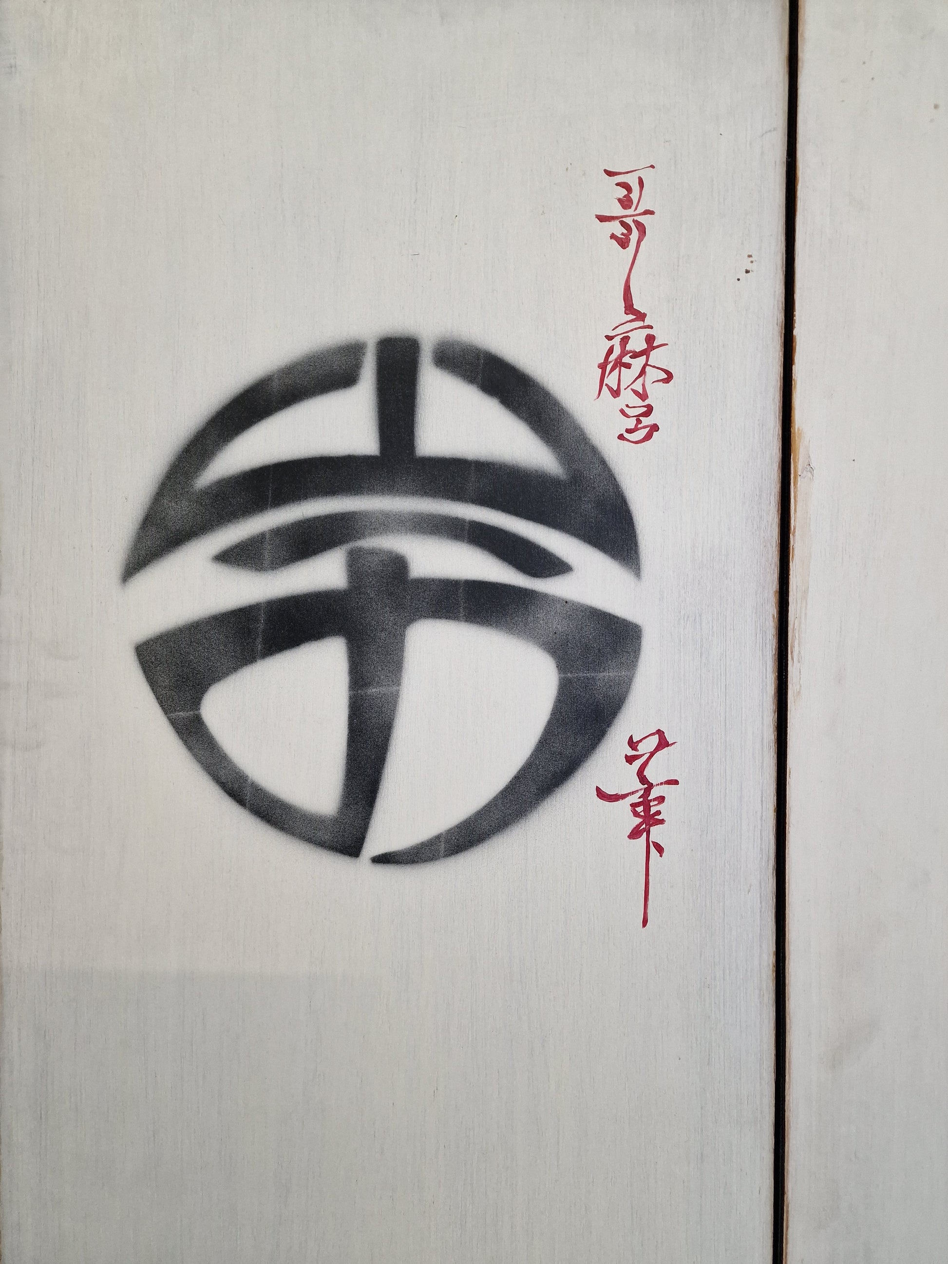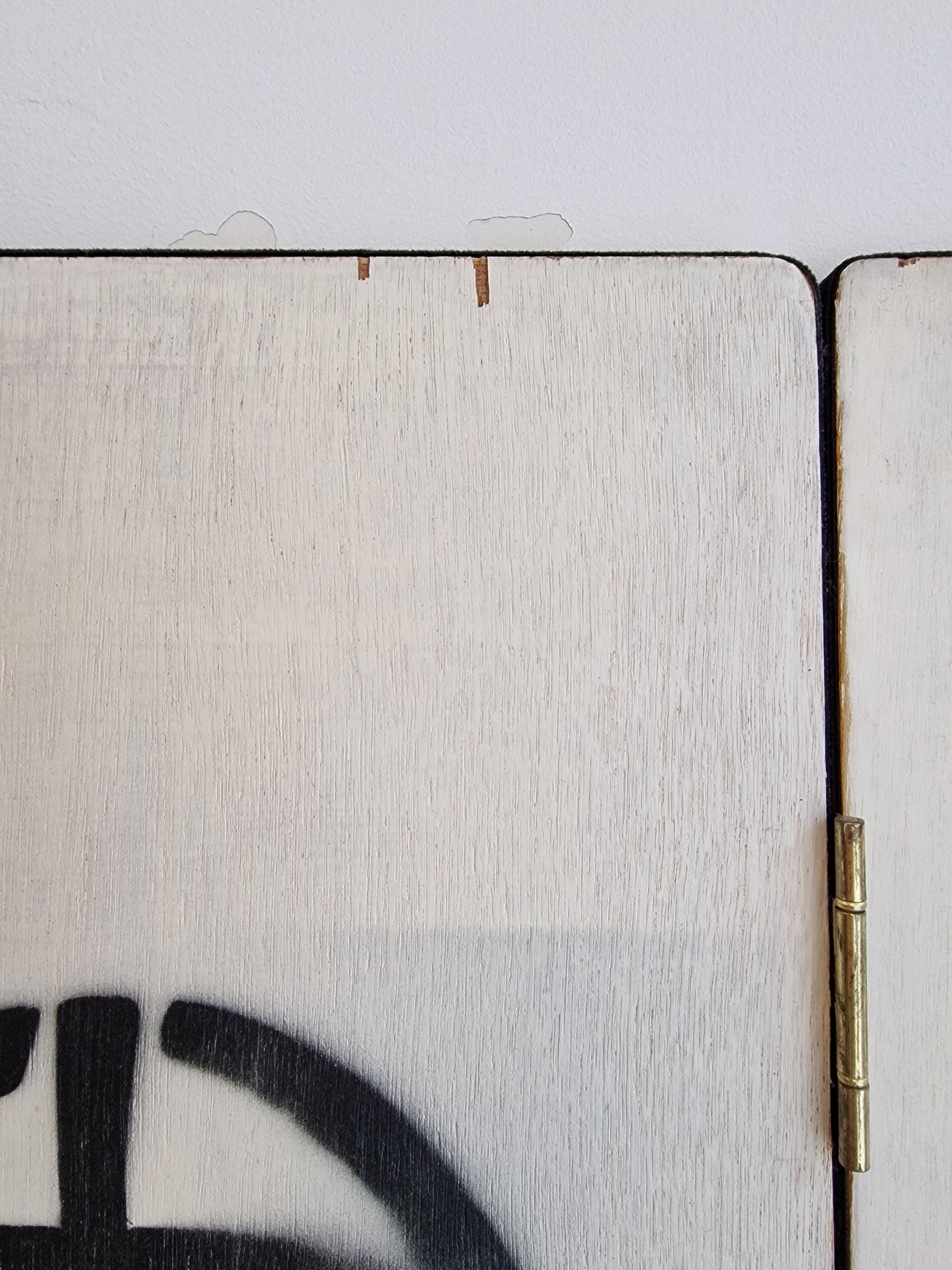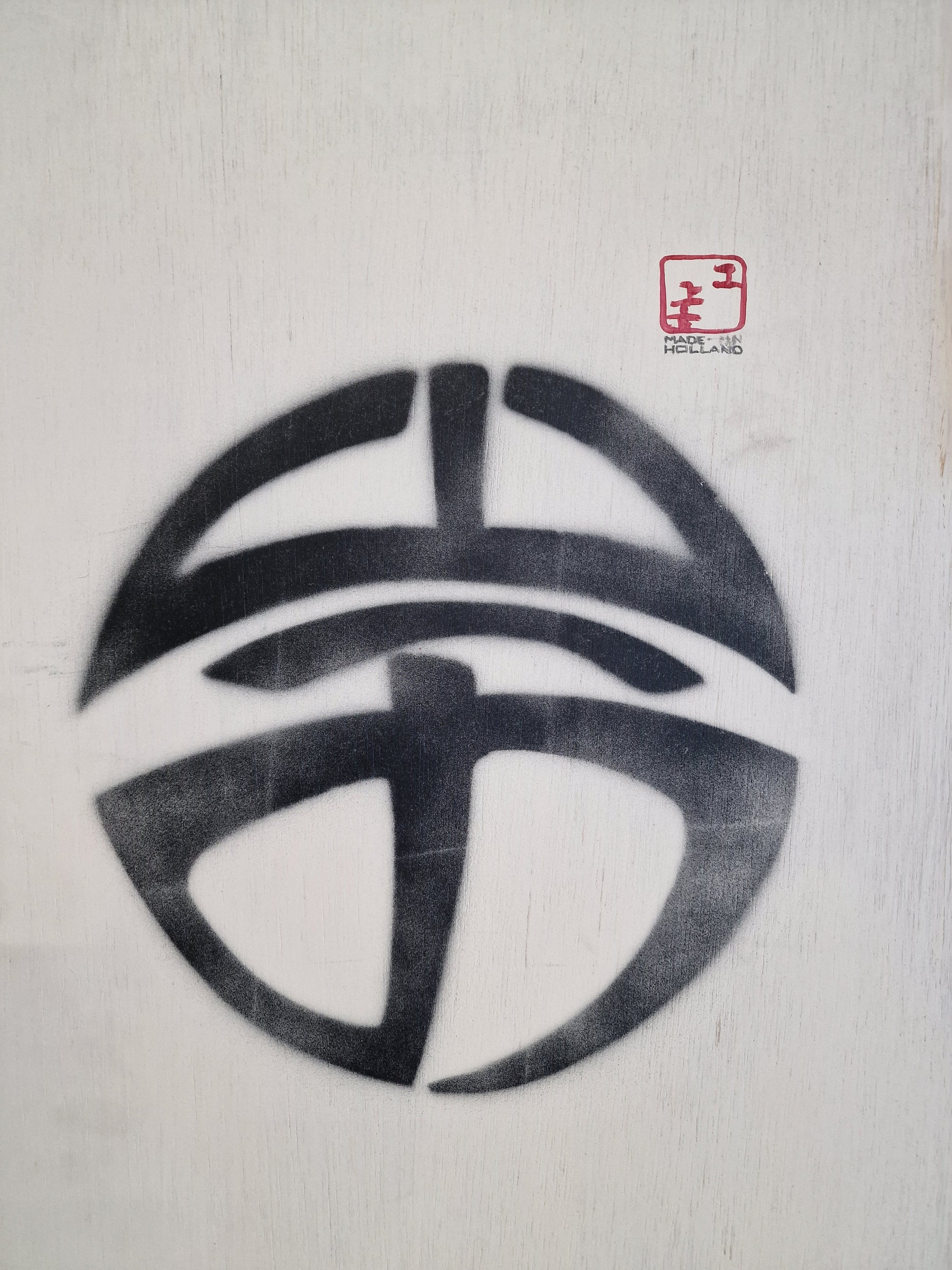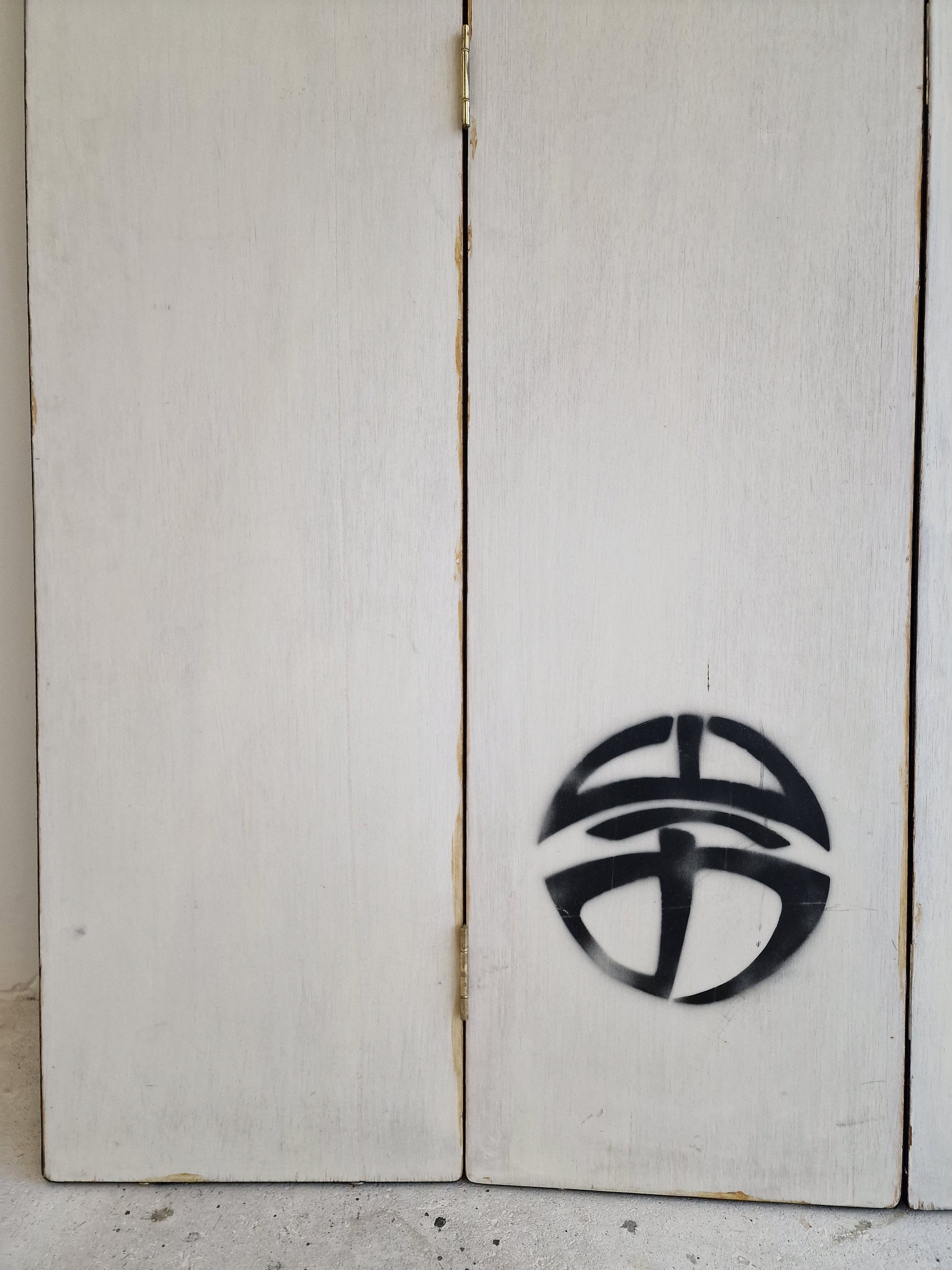 This large hand-painted folding screen combines Japanese visual influences with Dutch studio craftsmanship. Created in 1988, it features a multi-panel wooden construction decorated with stylized emblems and expressive painted figures, referencing traditional Japanese aesthetics through a contemporary European lens.